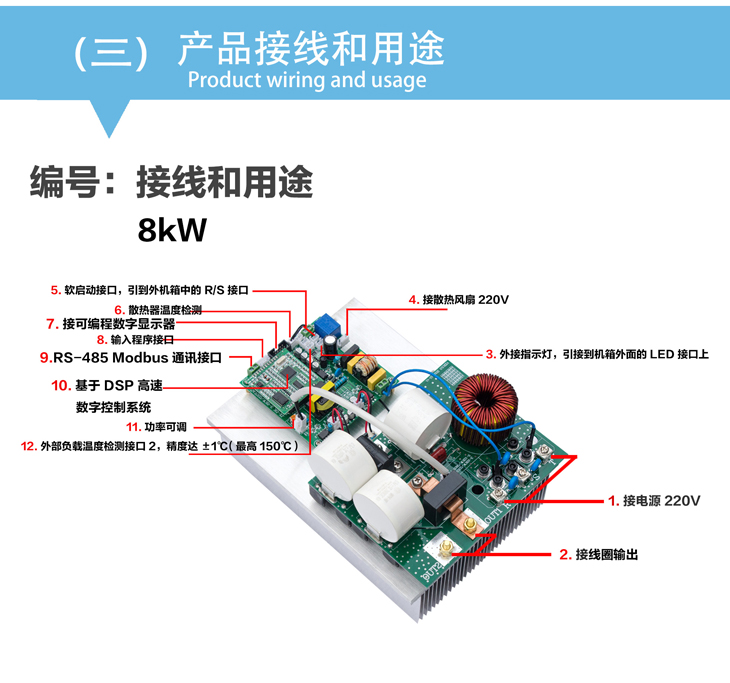 8kW/220V電磁加熱控制板是一種多用途的高效加熱節(jié)能產(chǎn)品,具有節(jié)電效果顯著,升溫速度快,熱效率高,降低生產(chǎn)環(huán)境溫度等顯著特點。本產(chǎn)品是采用本公司第五代數(shù)字處理平臺技術(shù),嵌入式32位處理系統(tǒng),全數(shù)字鎖相跟蹤處理。主板接口豐富,支持標準modbus RTU通訊協(xié)議,可輕而易舉實現(xiàn)觸摸屏人機對話、遠程控制??蓮V泛應(yīng)用于炒貨機,智能炒菜設(shè)備,小型管道,平面比較大功率密度加熱。效率可達98%。